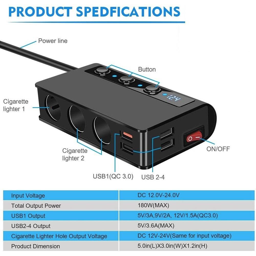 180W Spladeur de briquet de cigarette Charge rapide 3.0 Adaptateur de chargeur automatique 12V / 24V