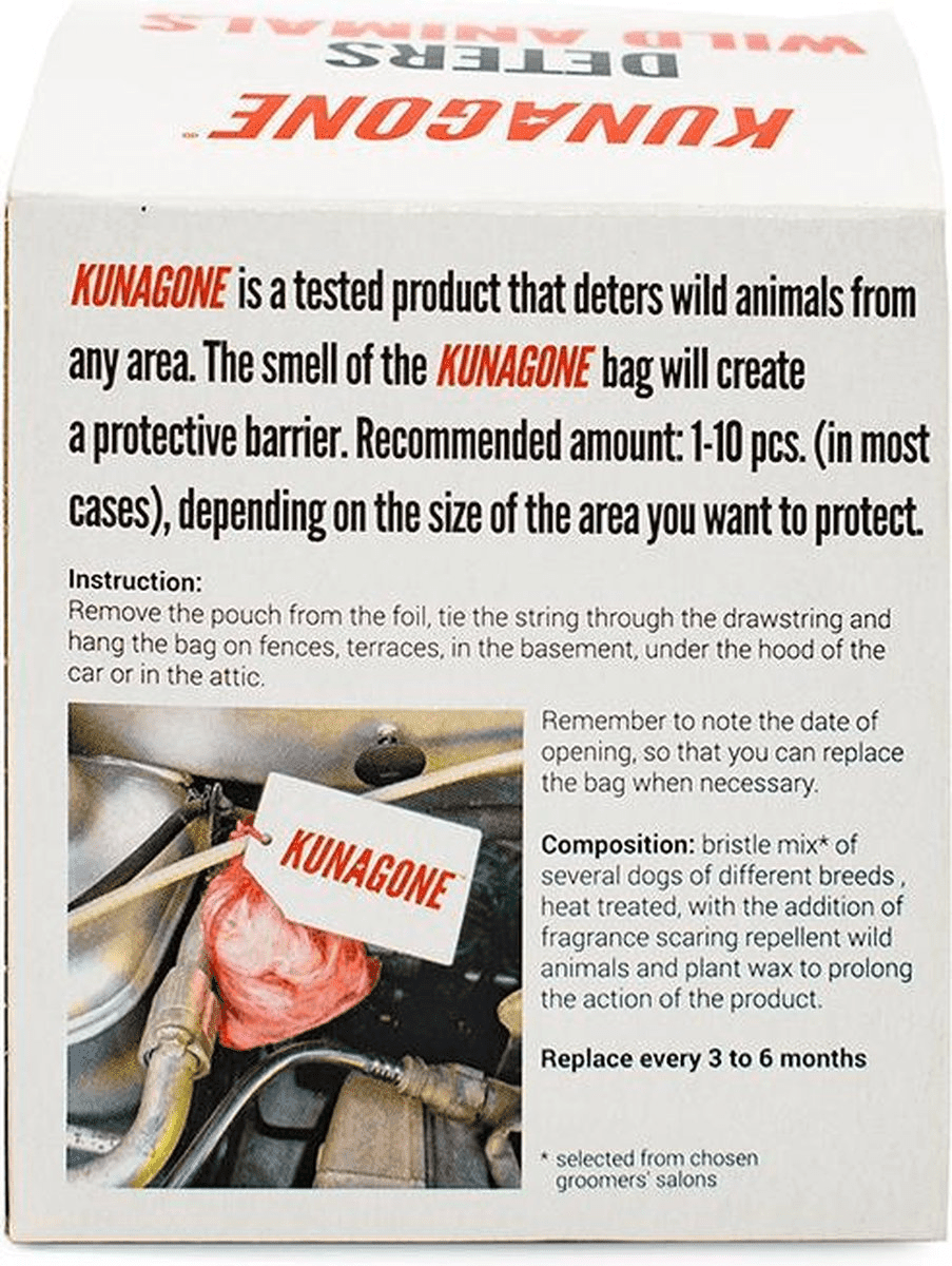 Le Kunagone marterverjager est une défense efficace pour garder les martens et autres animaux indésirables hors de votre véhicule. Cette exposition est facile à appliquer et offre une protection à long terme pour votre salle de moto. La couleur verte rend le produit discret, tandis qu'il contient des ingrédients naturels qui sont sans danger pour l'environnement.