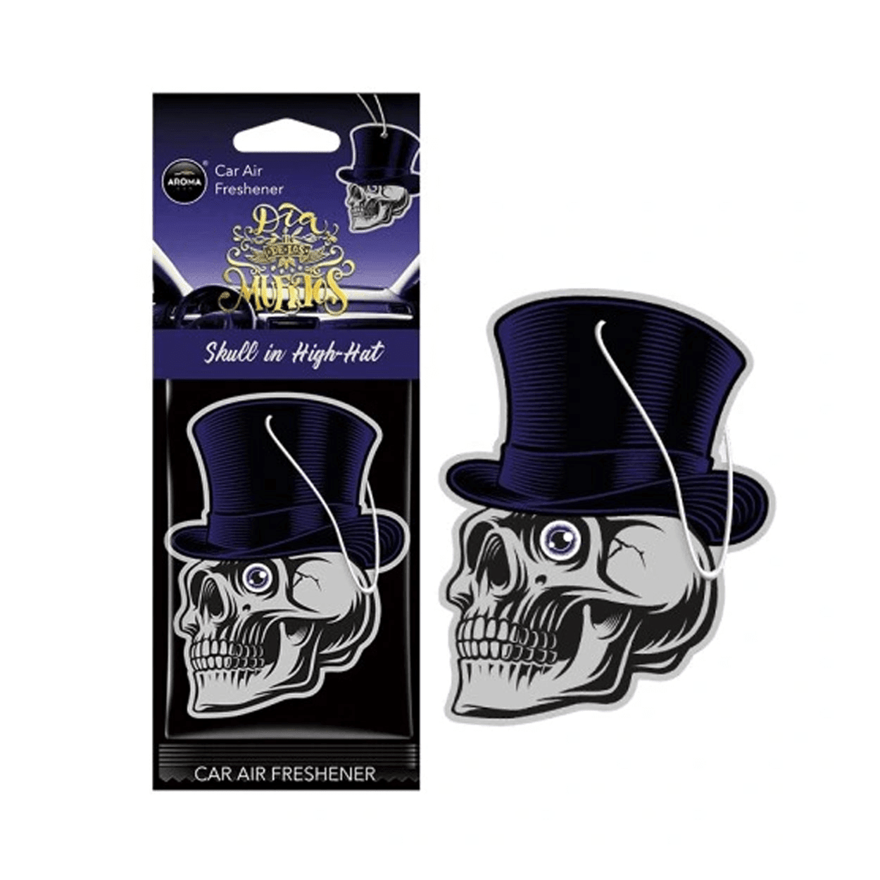 Rafraîchissez votre voiture avec l'arôme Dia de Los Muertos Air Faiilles. L'ancien parfum Black Hat offre une expérience de parfum luxueuse et raffinée. Le design du crâne frappant avec un chapeau noir donne à votre intérieur un accent cool et élégant. Facile à accrocher et idéal pour chaque voiture.