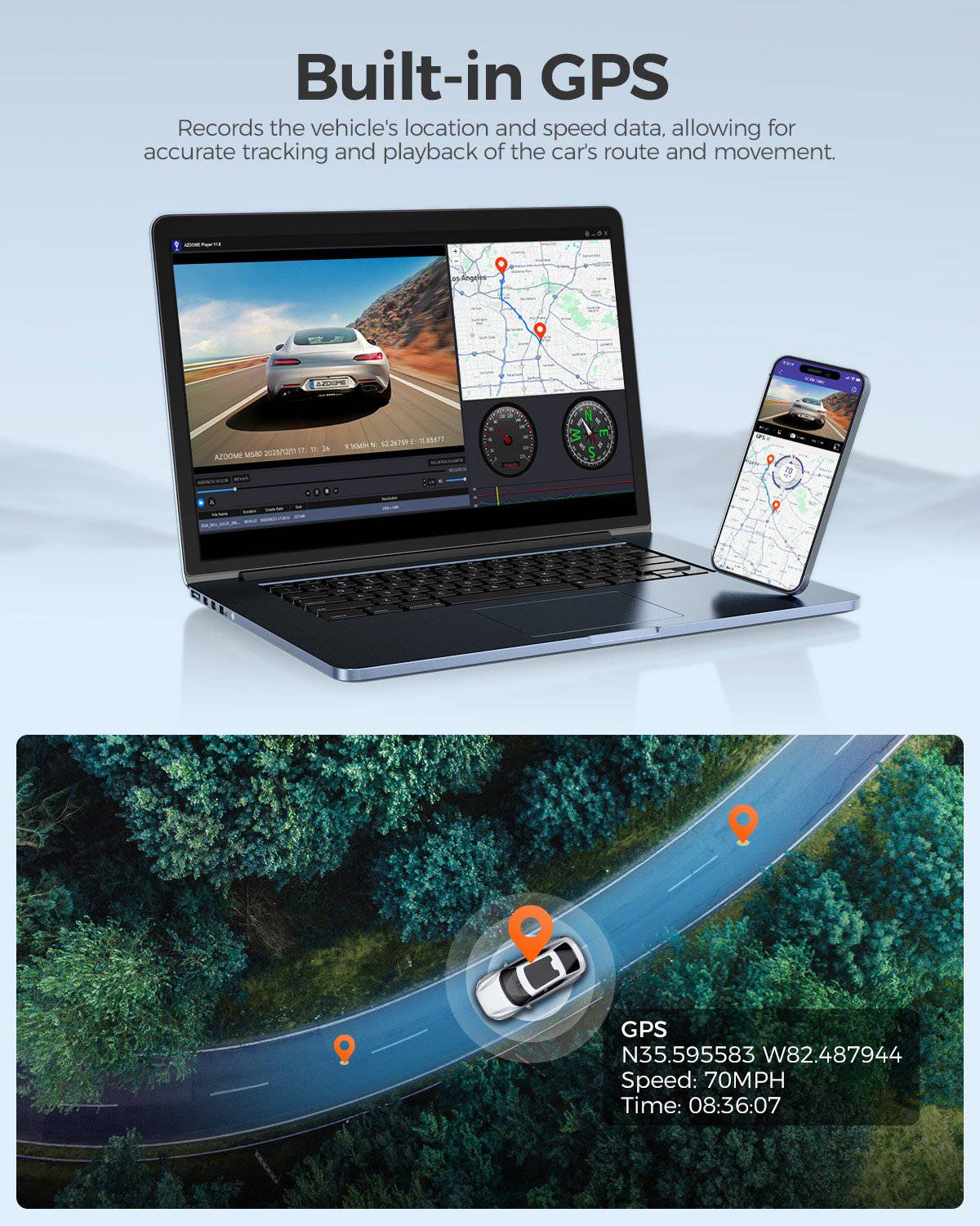 Avec la prise en charge du WiFi 5G / 2.4G, l'enregistreur vidéo M580 propose des téléchargements rapides et partage des images enregistrées. De plus, avec le GPSmodule construit, vous pouvez enregistrer des informations telles que l'itinéraire et la vitesse. L'appareil fonctionne également avec l'AzdomEAPP, avec lequel vous pouvez facilement gérer les paramètres, modifier les enregistrements et les partager avec des amis.