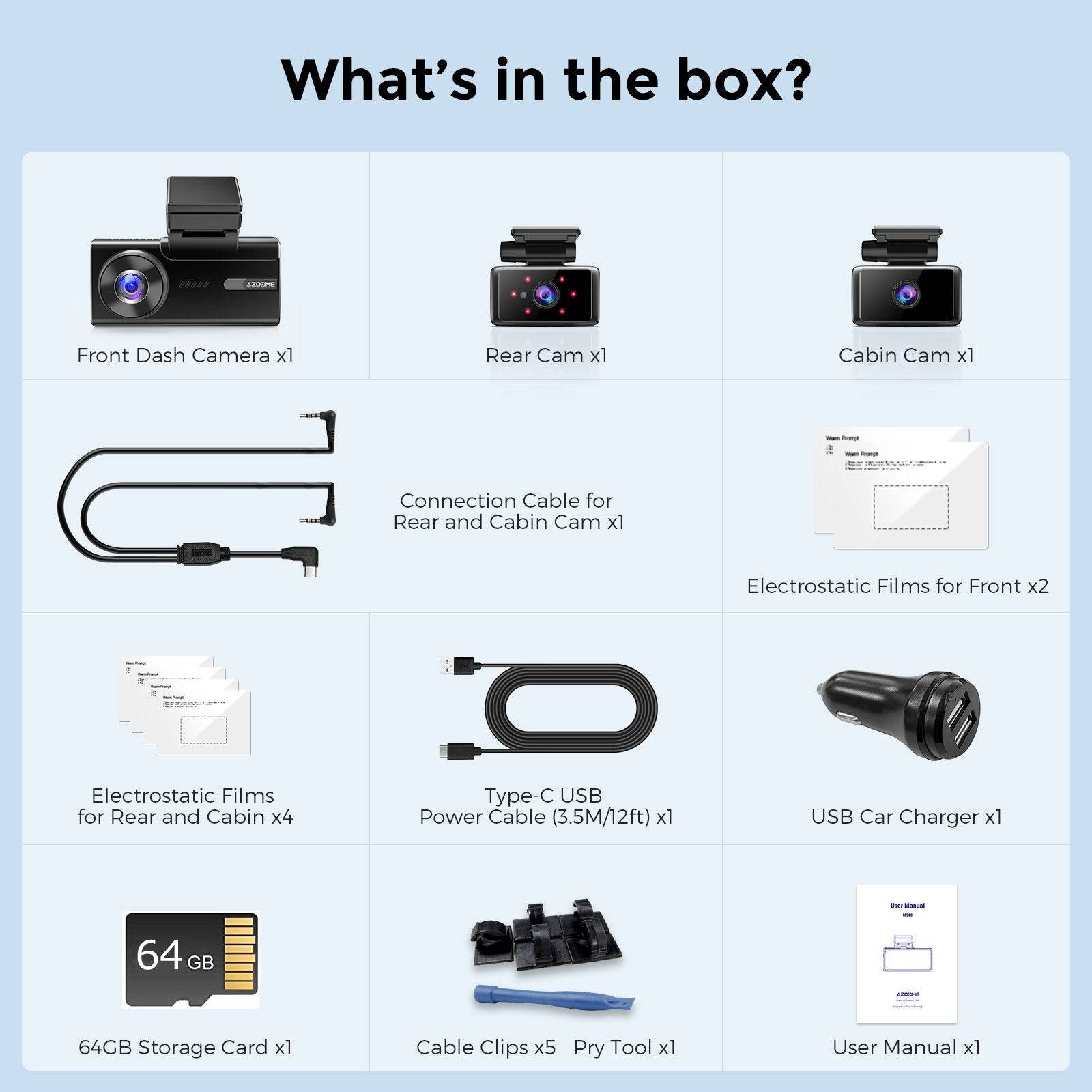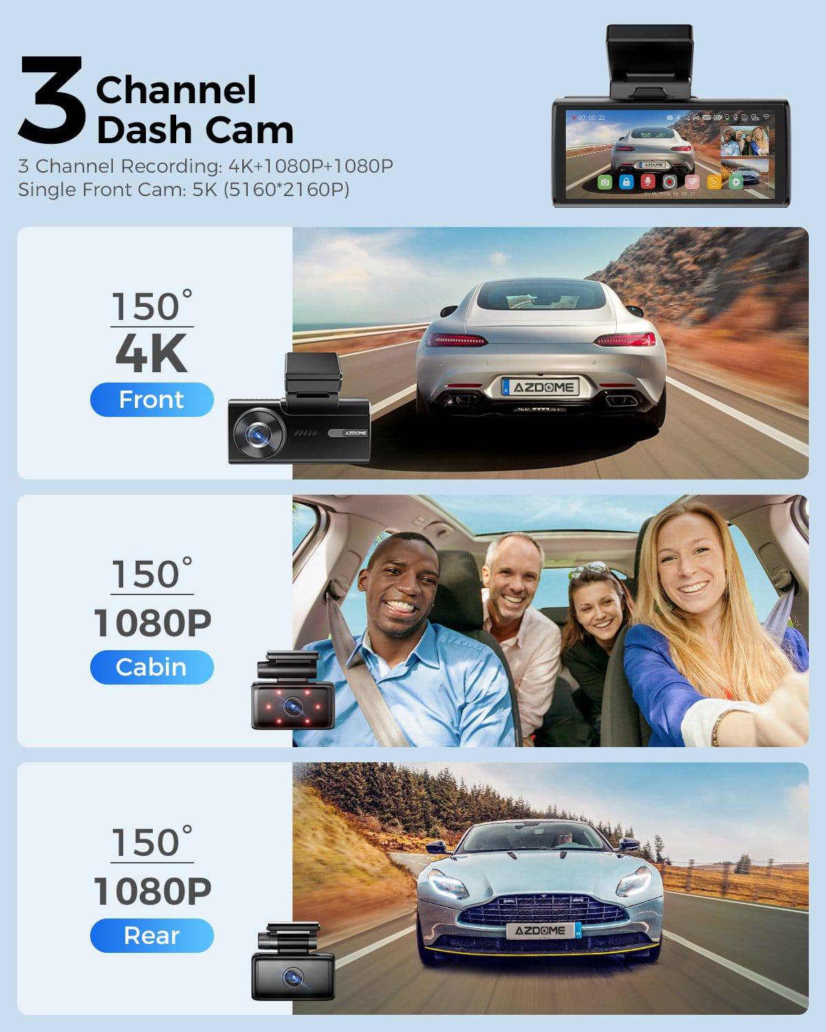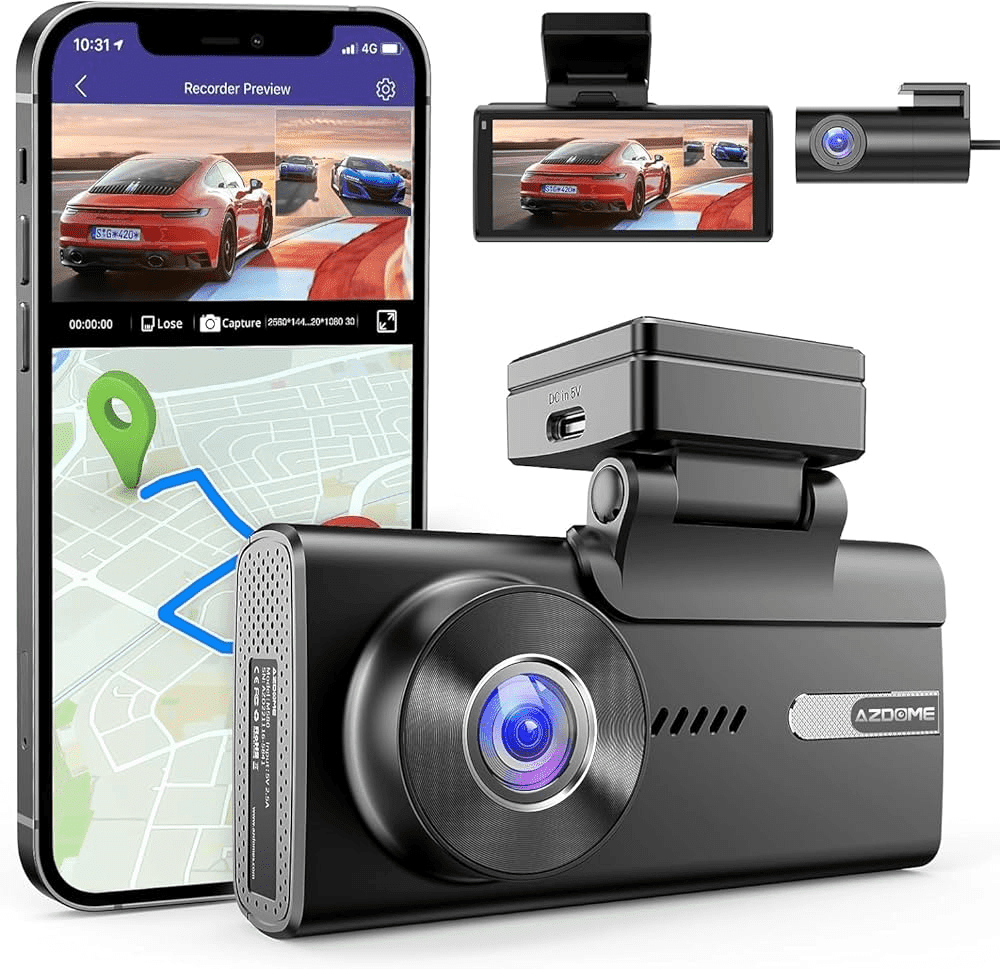 Azdome Dashcam M580 Pro 5K 3CH WiFi Auto Enregistreur vidéo 64 Go + intérieur et derrière la caméra noir