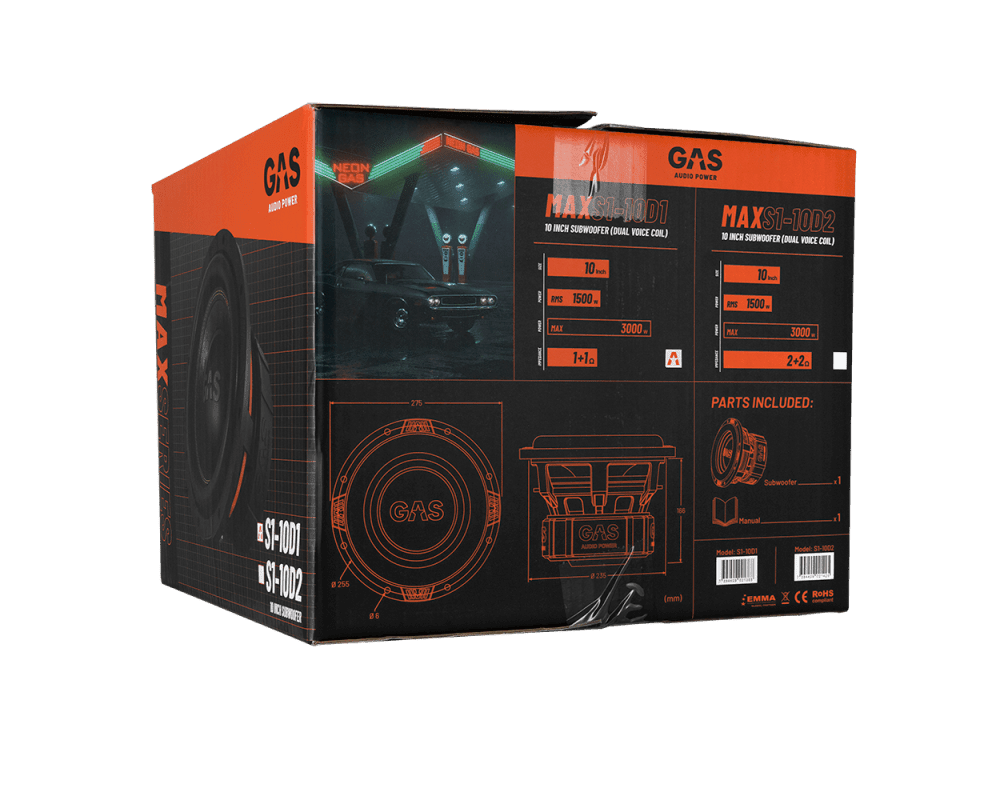 Gas Power Power Gas Max Niveau 2 Subwoofer 10 "2x1 ohm pour les systèmes de son de voiture et qualité sonore de haute qualité