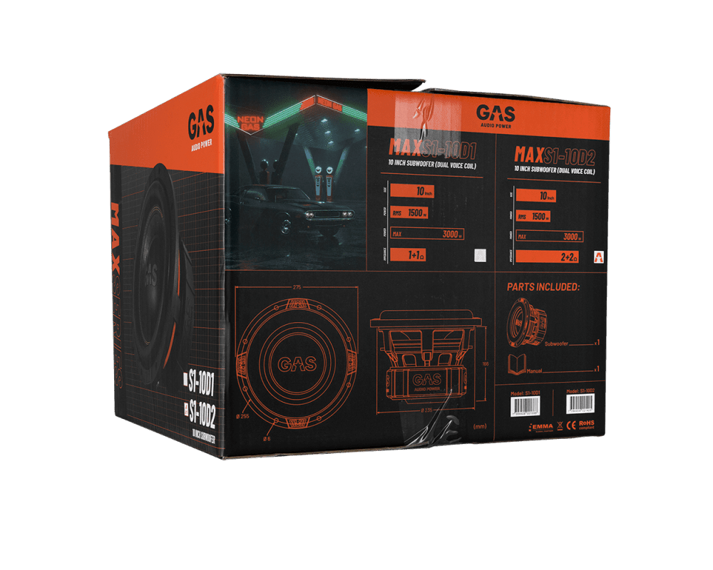 Gas Power Power Gas Max Niveau 2 Subwoofer 10 "2x2 ohm pour les systèmes de son de voiture et qualité sonore de haute qualité