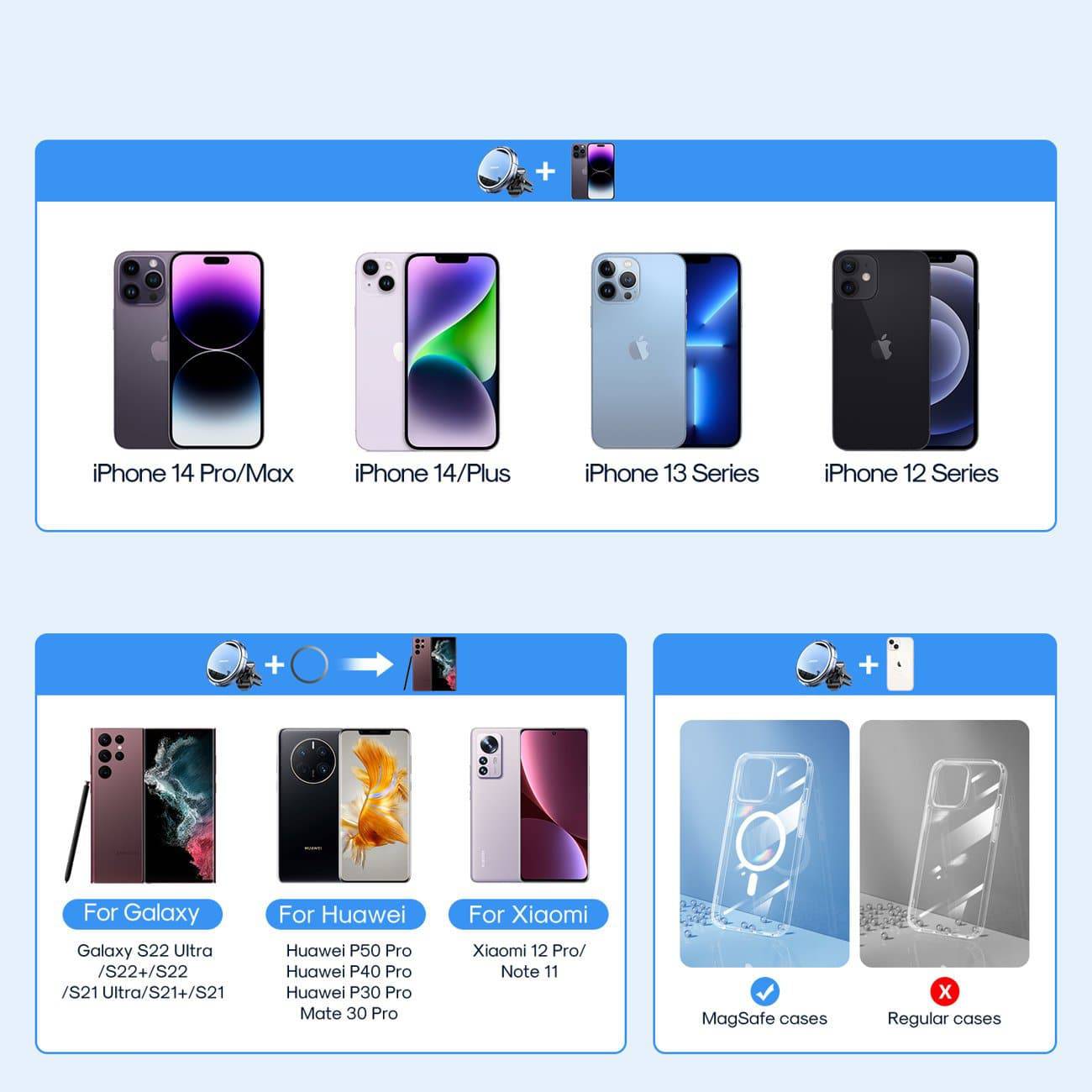 • Il fonctionne également très bien avec d'autres marques de téléphones, comme Samsung, Huawei, Xiaomi  Vous n'avez besoin que d'une couverture magnétique ou d'un autocollant magnétique