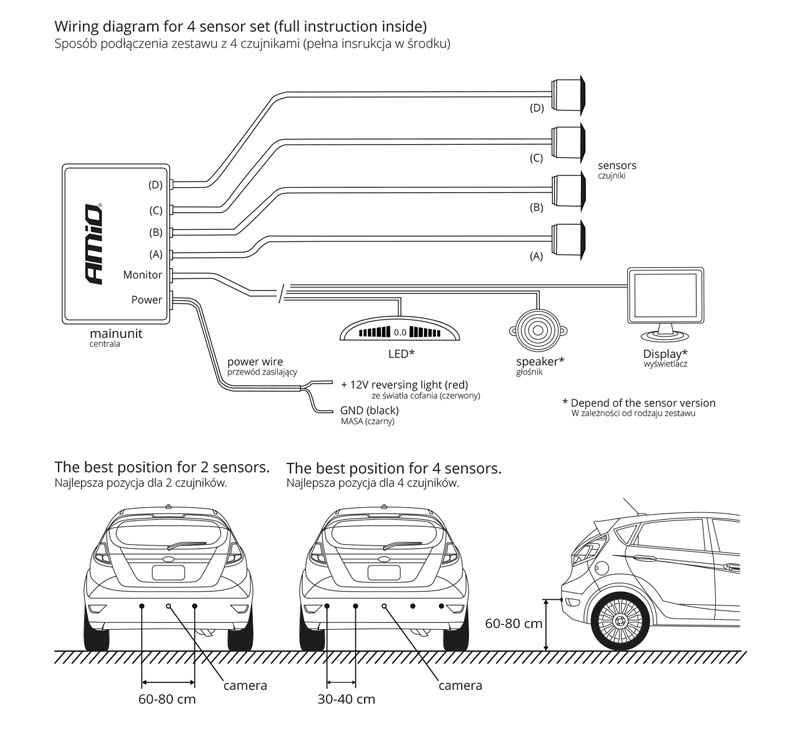 Système d'aide au parking du capteur de stationnement Amio LED avec 4 capteurs noirs