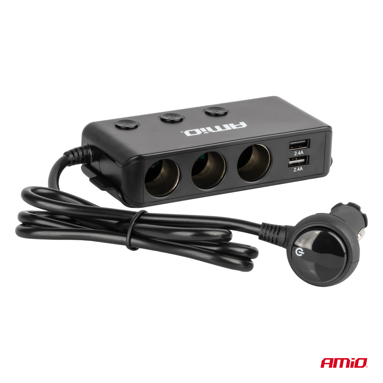 AMiO 3 Dubbele Sigarettenaansteker Plug Splitter met (3x USBA & 1x USBC) 12V/24V en Voltmeter Zwart