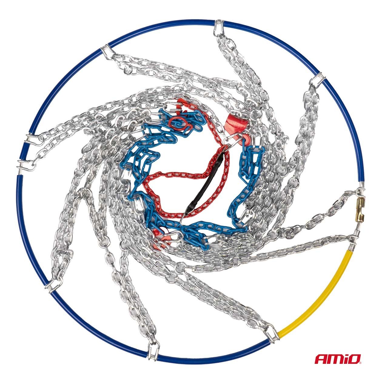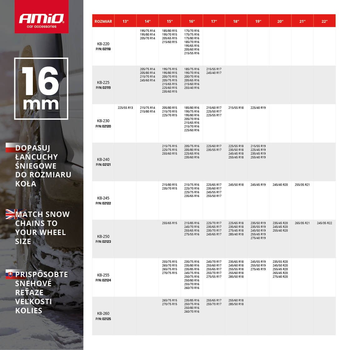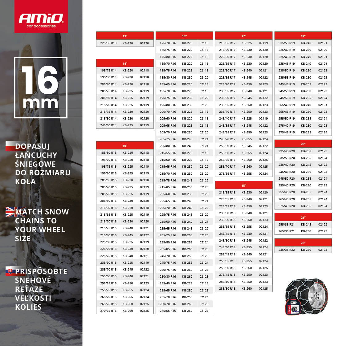 AMiO sneeuwkettingen KB240 zijn ideaal voor voertuigen tot 7500 kg en bieden uitstekende grip op sneeuw en ijs. Met een schakelhoogte van 16 mm en vervaardigd uit gehard staal, zorgen deze kettingen voor optimale tractie en duurzaamheid onder zware winterse omstandigheden. Ze zijn compatibel met ABS en ESPsystemen, wat zorgt voor extra veiligheid en stabiliteit tijdens het rijden.