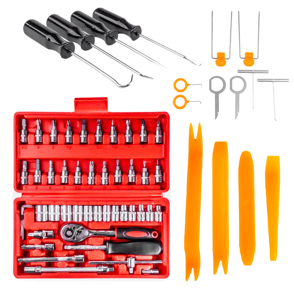 • Aantal onderdelen: 46-delige dopsleutelset + 12-delige paneltoolset + 4-delige haak- en pickset