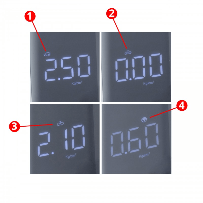 De modi zijn "Auto", "Motorfiets", "Fiets" en "Bal". U kunt de toets gebruiken om de modus te selecteren en de standaard luchtdrukwaarde wordt automatisch ingesteld.